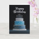 A striking birthday card featuring a shimmering blue and silver tiered cake set against a dramatic black background. With delicate details, glowing candles, and elegant “Happy Birthday” lettering, this design is perfect for a sophisticated and memorable celebration.