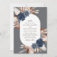 Diese wunderschöne, elegante Hochzeitseinladung mit boho blumengeschmückten Arrangements (inklusive Pampas Gras) in den gegenüberliegenden Ecken, mit einer weißen ovalen Form in der Mitte. Die Farbe ist braun, marineblau, Elfenbein und Beige. Die Hintergrundfarbe kann auf jede gewünschte Farbe angepasst werden (in einem blau-farbenen Grau dargestellt). Die Rückseite der Karte ist ein passendes marineblau, aber die Farbe kann leicht angepasst werden, wenn gewünscht. Für Design- oder Produktanfragen können Sie sich an mich (Tracey) unter orabellaprints@outlook.com wenden.