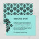 Bedanken Sie sich bei Ihren Gästen dafür, dass sie die zukünftige Braut mit zeitloser Eleganz gefeiert haben, mit der Damast-Brautparty-Dankeskarte von Elegant Bride & Co. Diese Karte wurde entworfen, um ein gehobenes Bridal Shower oder Brunch zu ergänzen und verfügt über eine verfeinerte Teal-Farbpalette und eine elegante Kronleuchter-Silhouette, die klassische Raffinesse ausstrahlt. Perfekt zum Ausdruck von herzlicher Dankbarkeit bietet sie eine schöne Möglichkeit, sich bei den Gästen für ihre Liebe, Anwesenheit und ihre durchdachten Geschenke zu bedanken. Diese Dankeskarte hinterlässt einen bleibenden Eindruck und spiegelt die unverwechselbare Ästhetik von Elegant Bride & Co. wider: romantisch, elegant und mühelos chic.