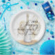 Stylish Happy New Year party paper plates feature a watercolor champagne bottle with gold and white balloons and your details in chic lettering.