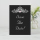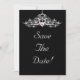Elegantes Hochzeitskartendesign Save the Date mit einem hochdetaillierten silbernen Kronleuchter auf schwarzem Hintergrund. Dieses Design kommt auf mehrere Schreibwaren, um ein schönes Thema für alle Ihre Hochzeitsarbeit.