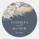 Enhance your wedding stationery with this elegant round sticker featuring original watercolor pampas grass, off-white florals, and earthy botanical accents set against a rich dark blue background. Perfect for sealing envelopes, dressing favor bags, welcome boxes, or gift packaging. Personalise with your names and wedding date to create a cohesive, stylish detail that suits boho, rustic, modern, or romantic wedding themes.