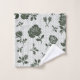 Two patterned towels are displayed with a floral design. The top image shows a towel hanging on a rod, while the bottom shows a washcloth with a turned corner.