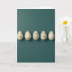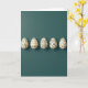 This design shows five cream-colored egg shapes arranged in a neat row across a deep, muted teal background, viewed from above like a quiet tabletop scene. Soft, diffused light gives each egg a gentle lift from the surface, with long, faint shadows stretching to one side. Each egg is decorated with thin black line art, mixing angular geometric slices, flowing wave lines, tight swirls, and small icon-like marks that resemble stars and diamonds. The repeating cream-and-black pairing ties them together, like close friends dressed for the same occasion while still showing their own style. A small greeting in black sits near the top center, with a second line in a lighter cream placed below it, leaving plenty of open space around the artwork 🌷. The overall layout feels calm and affectionate, as if the eggs are leaning into one another through their matching patterns 🐇. The far-right egg shows a cluster of tiny star shapes near its upper curve, with a slim shadow tapering beneath it.