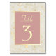 Einfache, elegante, moderne, beige und staubige Rose-Tischnummer in Elfenbein mit raffinierter, blumenvergoldeter Spitze. Die perfekte Wahl für den zeitgenössischen Hochzeitsempfang.