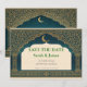 Announce your wedding day with this stunning Save the Date card. Featuring a deep emerald teal background and a sophisticated gold ornate arch with subtle celestial accents. This modern-vintage design is the perfect first glimpse into your elegant wedding celebration. High-quality print with a luxurious feel.