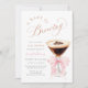 Announce your baby shower with this elegant "A Baby is Brewing" invitation, inspired by the rich allure of espresso. This design beautifully merges the theme of new beginnings with the sophisticated charm of a coffee-themed celebration. The centerpiece is a detailed watercolor of a martini glass with coffee and beans, complemented by a delicate pink bow, symbolizing sweetness and anticipation. The phrase "A Baby is Brewing" is rendered in a beautiful script, making it a perfect invitation to gather friends and family to honor the mom-to-be. This invitation is sure to set a delightful tone for your upcoming event.
