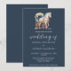 Elégant Cheval tiré de transport Faire-part de mariage. Rejoignez-nous pour une célébration élégante pendant que nous échangeons des voeux entourés des riches teintes d'un mariage romantique. Notre mariage vous propose un magnifique mélange d'une calèche tirée par un beau cheval blanc aux couleurs bleues romantiques, le tout accentué par le charme intemporel de la calligraphie script. Venez profiter de la chaleur et de l'élégance de la saison avec nous pour cette journée spéciale.