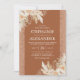 Elégante invitation à un mariage de saumons boho avec des feuilles de palmiers secs à l'aquarelle du désert, de l'herbe à la pampa, des fleurs, une parties scintillant couleur rouille et un modèle mariage moderne.