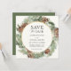 Faire-part de mariage sur le thème de l'hiver élégant avec un cadre doré entouré de branches persistantes aquarelles et de pommes de pin. Personnalisez avec vos informations ou cliquez sur "Cliquez pour personnaliser davantage" pour modifier les styles de police, la taille et les couleurs.