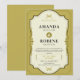 Invitation vos proches avec ce faire-part de mariage d'or classique, conçu pour une romance intemporelle et une élégance raffinée. Doté de bordures ornementales, de polices de serif formelles et d'une palette de couleurs sophistiquée, il est idéal pour les cérémonies traditionnelles ou formelles. Détails : Cadres et défilement en or orné détails typographie en serif avec noms de mariée et de mariée affichés Comprend tous les détails de l'événement : date, heure et lieu Aménagement élégant parfait pour les mariages haut de gamme Entièrement personnalisable avec votre libellé personnel