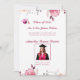Cette élégante faire-part de graduation florale présente une aquarelle douce avec des fleurs roses et violettes encadrant le texte. Les accents dorés et la police de caractères stylisée ajoutent une touche sophistiquée, tandis qu'une petite icône de casquette rose améliore le thème festif. Parfait pour honorer un diplômé avec une esthétique féminine et classe. Entièrement personnalisable pour les détails personnels.