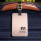 Modern fully customizable luggage tag design with bold monogram, FAUX rose gold and black background.