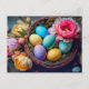 Auf dieser Postkarte finden Sie einige bunte Ostereier, die in einem Korb liegen und von schönen, frischen Blume umgeben sind. Sie können auch den Text in dieser Karte ganz einfach personalisieren, um diesen Gruß persönlicher zu machen.