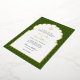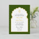 Elegante, schicke Goldfolie mit traditioneller Ganesh in einem goldenen Bogen mit dunkelgrünem und goldenem Paisley-Hintergrund. Ideal für indische Hochzeiten.