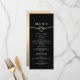 Ajoutez une touche sophistiquée à vos tables de réception avec cet élégant menu de dîner doré et noir mariage. Doté d'un coeur romantique à cordes d'or, d'un arrière - plan noir minimaliste et d'une calligraphie moderne, ce menu est la meilleure façon de présenter votre repas soigneusement préparé. Personnalisez-le avec votre date de mariage et de délicieuses sélections pour une présentation polie et mémorable.