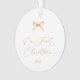 Celebrate your love story with this elegant white Christmas ornament featuring the phrase “Our First Christmas” in refined gold calligraphy. The minimalist white background creates a timeless and romantic look, perfect for newlyweds or couples marking their first holiday together. A beautiful keepsake to cherish for years to come.