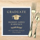 Elegant dunkelblaue Graduiertenservietten mit goldener Graduiertenkappe, Graduate und dem Namen, Schule und Klassenjahr des Absolventen in klassischer Serifentypografie.