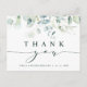 Dieses Dankeschön an die Postkarte zeigt die bemalten Aquarellen Eukalyptus, botanisches Grün und hellblaue Blätter mit moderner Kalligraphie. Ideal für Hochzeiten, Geburtstage, Abschlüsse und andere Veranstaltungen.
