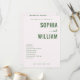 This wedding program features a minimalist and elegant design with a clean white background accented by light green text. The layout is vertically oriented, showcasing the names "Sophia" and "William" in bold, uppercase letters, complemented by a cursive "and" for added sophistication. The ceremony details are neatly listed in a sans-serif font, maintaining readability and simplicity. Customizable placeholders allow for personalization of dates and locations, making it perfect for any wedding celebration. The overall style exudes modernity and refinement, ideal for couples seeking a sophisticated yet uncluttered aesthetic for their special day.