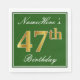 Dieses einfache und elegante Papier-Serviette-Design enthält eine Nachricht wie "NameHere’s 47th Birthday" (mit dem "47th" mit einem Imitat in goldener Farbe) in einem grünen Bereich mit einer einfachen Kontur der Grenze. Der Name ist in einem Skript-ähnlichen Text mit weißer Farbe und kann angepasst werden. Napkins wie diese könnten vielleicht auf einer Geburtstagsfeier für jemanden verwendet werden, der seinen siebenundvierzigsten Geburtstag feiert. [~Z0000137]