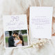 Herzlichen Dank für diese anmutige Foto Hochzeit Dankeschön-Karte mit einem handgezeichnet Lavendelbogen und "Danke" in der weichen Lavendelkalligraphie auf weißem Hintergrund. Fügen Sie Ihre Namen und das Hochzeitdatum über Ihrem horizontalen Foto für einen Pfand, der Ihren besonderen Tag einfängt. Die Rückseite der Karte bietet Platz für Ihre persönliche Danksagung, sodass Sie mit Familie und Freunden echte Dankbarkeit teilen können. Mit seinen sanften Lavendelakzenten ist dieses Design perfekt für romantische, skurrile oder Frühjahrshochzeiten.