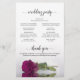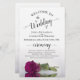 Diese Hochzeitsprogramme sind elegant und geschmackvoll, aber dennoch preisgünstig. Das Design umfasst eine lila, magentafarbene und beerfarbene Rose, die sich auf der Seite eines Single befindet und in einem Wasserbecken mit Wellen und Wellen reflektiert. Die Typografie zeigt eine laky schwarze Schriftzeichen-Kalligraphie, und es gibt Raum für Details über die Zeremonie, das Brautparty, und ein kurzes Dankeschön.