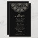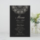 Set the tone before the first bite. This wedding menu features a bold black backdrop with intricate mandala detailing, blending Indian elegance, boho chic style, and henna-inspired artistry. Delicate floral lace elements add a romantic touch, making it perfect for receptions that honor tradition with flair. Whether you're hosting a formal black-tie affair or a soulful celebration, this design brings depth, drama, and intention to your tablescape. Every detail speaks with meaning—and beauty.