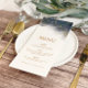 Élevez votre réception de mariage avec cette carte de menu luxueuse. Avec son design sophistiqué en marbre bleu marine aux accents dorés chatoyants, cette carte de menu ajoute une touche d'élégance à vos tables. La typographie moderne et la disposition élégante présentent magnifiquement vos options de restauration, ce qui améliore l'esthétique globale de votre journée spéciale. Personnalisez-le pour qu'il corresponde à votre menu et créez un ensemble de papeterie mariage cohésif et étonnant que vos invités admireront.