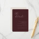 This elegant wedding enclosure card features a sophisticated maroon background with an understated, cursive typography that adds a touch of timeless charm. The design is simple yet refined, focusing on the essential details in a clean and modern layout. Perfect for conveying important information about accommodations and additional wedding details, this card exudes a sense of grace and formality, making it ideal for couples aiming to create a cohesive and polished look for their special day. Its minimalist style ensures it complements any wedding theme while maintaining a focus on clarity and elegance.