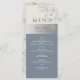 Ajoutez une touche d'élégance à votre mariage d'hiver avec ce magnifique menu boho-chic mariage. Dotée d'une belle toile de fond bleu poussiéreux, de fleurs dorées et d'un accent argenté, elle allie parfaitement éléments modernes et vintages pour un look sophistiqué et romantique. Idéal pour une fête d'hiver, ce menu apporte une touche unique et raffinée à votre journée spéciale.