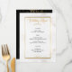 Ce menu Mariage élégant et formel est conçu avec un cadre couleur or sur un Arrière - plan blanc avec accents or. Le texte comprend : Menu Mariage, Appetizer, Entre et Sélections de dessert. Le texte inverse comprend : Les prénoms de la mariée et de la mariée, sur un arrière - plan noir avec des confettis de couleur or. Pour personnaliser, insérez simplement vos détails dans notre modèle facile, en remplaçant l'exemple de texte.