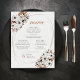 Ces menus de feuilles de papier vintage de 8,5 po x 11 po, légers et aérés, présentent un design floral noir et rouille avec du lettrage gris foncé sur un arrière - plan blanc d'os avec en-tête, "Menu" et des espaces réservés pour 2 entrées, 2 entrées, 2 côtés et 2 desserts.