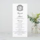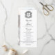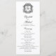 Cet élégant programme de mariage en noir et blanc présente une crête ornée au sommet avec les initiales monographiques de la mariée et du marié en caractères de script formels fantaisie, et une photo du couple heureux au dos du texte de la fête de mariage.