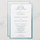 Elégant programme de mariage en verre de mer avec un beau monogramme dessiné à la main et un cadre aquarelle dans les teintes turquoise en verre de mer. Eléments calligraphiques modernes écrits à la main. Possibilité de modifier et d'ajuster le texte en sélectionnant "Modifier à l'aide de l'outil de conception". Avant avec les détails de la cérémonie mariage, retour avec les noms de la fête de mariage et message de remerciement pour vos invités. Une partie de notre collection "Sage Sea Glass Watercolor, Botanical Monogram Mariage" avec une variété de produits de coordination disponibles.