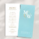 Elegante Monogram Wedding Menu Card. Mit goldfarbenem Text auf weiß. Zurück zeigt Braut & Bräutigam Monogramm-Initialen mit dekorativem goldenen Ampersand, und in Weiß Braut und Bräutigam Namen, Datum, Position, über Meerglas aquamarin blaue Farbe. Wir laden Sie ein, unseren Zazzle-Shop, Beachy Design Co, zu besuchen, um sich passende Produkte und mehr anzuschauen. Bitte kontaktieren Sie uns, wenn Sie Hilfe benötigen.