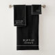 Élégant monogramme personnalisé blanc serif prénom et script nom de famille, serviette de bain set bordure blanche sur noir. Rafraîchissez votre décor de salle de bain avec un style typographique minimaliste.