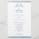 Elégant programme de mariage bleu avec un délicat monogramme botanique dessiné à la main avec initiales de couple et encadré par de belles bandes d'aquarelle bleue. Possibilité de modifier et d'ajuster le texte en sélectionnant la personnaliser plus loin. Avant avec les détails de la cérémonie mariage, retour avec les noms de la fête de mariage et message de remerciement pour vos invités. Elégant, simple et gracieux. Initiales dans la typographie moderne élégante de bloc. Même design avec initiales en calligraphie classique également disponible. Une partie de notre collection "Mariage de monogrammes botaniques d'aquarelle bleue" avec une variété de produits de coordination disponibles, y compris le menu, les cartes de sièges de table, les numéros de table et les cartes de remerciements. Visitez la collection entière avec ce lien : https://www.zazzle.com/collections/blue_watercolor_botanical_monogram_wedding-119923294821263262