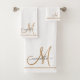 Élégant monogramme d'or personnalisé nom de serviette de bain set bordures d'or sur blanc. Rafraîchissez votre décor de salle de bain avec un style typographique minimaliste.