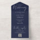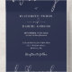 Alles in einer Hochzeitseinladung mit eleganter Typografie auf marineblau-blauem Hintergrund. Die Einladung enthält eine perforierte RSVP-Karte mit QR-Code. Entwickelt von Thisisnotme©