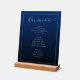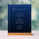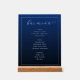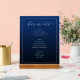 This elegant wedding menu features a deep navy blue background with crisp white text, creating a sophisticated and modern look. The layout is clean and organized, divided into sections for Beer, Wine, and Spirits, each presented in a neat, sans-serif font that enhances readability. A touch of cursive script adds a refined flair to the title "bar menu," while ample spacing ensures a clutter-free presentation. Ideal for weddings or upscale events, this design balances functionality with aesthetic appeal, conveying a mood of refinement and clarity.
