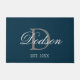 Elegant Navy Blue Script Monogram Name Doormat Design mit anpassbarem dunkelblauen Hintergrund und hellgrau Monogramm Initial in der Mitte. Personalisiert mit dem Nachnamen des Ehepaares in klassischer Schriftzeichen mit weißer Kalligraphie und Jahr in weißen Zahlen auf der unteren Vorderseite. Das ist eine großartige Geschenkidee für die Hauswärmung.