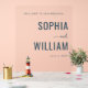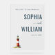 This elegant wedding sign features a minimalist design with a dark background, highlighting the central elements in a sophisticated layout. The color palette includes deep navy blue and soft gray hues, complemented by an illustration of a charming lighthouse at the bottom left corner, adding a nautical touch. The typography combines clean sans-serif fonts for the welcoming message and bold serif typeface for the names, creating a timeless and refined aesthetic. Perfect for setting the tone at a formal wedding, this sign exudes tranquility and sophistication, making it an ideal addition to any celebration.