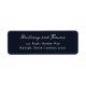 These return address labels feature a sophisticated and elegant design with a clean, centered layout on a deep navy background. The text is presented in an elegant script font for the names, followed by a classic serif font for the address, creating a timeless and formal look. The minimalist style emphasizes clarity and refinement, making it perfect for special occasions or formal correspondence. The strong contrast between the white text and navy backdrop ensures legibility while evoking a sense of calmness and sophistication.