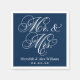 Hochzeitsnapkins zeigen "Mr. & Mrs." in einem Schriftart mit weißer Kalligraphie, mit individueller Monogrammgestaltung, die mit dem verheirateten Namen und dem Hochzeitsdatum der Braut und des Bräutigams personalisiert werden kann. Navy Blau und Weiß Farbschema.