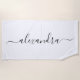 Serviette de plage moderne avec un élégant nom de script noir sur un simple arrière - plan blanc. Personnalisez avec votre nom.