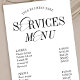 Elégant tarif d'entreprise avec police de calligraphie nostalgique dans un design noir et blanc minimal. Ce menu de services tendance comprend de l'espace pour vos prix, le logo de l'entreprise et les coordonnées. Cette fiche de prix est entièrement modifiable et est parfaite pour utiliser comme carte de menu pour votre spa de beauté, barre de fouet, salon de coiffure ou tout autre service professionnel.