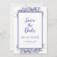 Mit unserer eleganten, floralen und floralen Hochzeitsankündigung Save the Date in periwinkelblau verkünden Sie Ihre Veranstaltung! Die Invitation Suite besticht durch ein botanisches Gartendesign mit stilvollen Farbtönen von Perwinkelblumen und weicher, üppiger Vegetation auf weißem Hintergrund. Personalisieren Sie das Hochzeitsdesign mit Ihren Vornamen und Datum in schicken Schriften und Schriften. Die Rückseite der Karte passt gut in Blau.