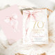 Elegant pink bow 70th birthday invitation. Feminine design in blush pink and gold. Features trendy watercolor coquette bow, and modern typography font. Perfect for an elegant style women's bday celebration. Personalize with your own details. Printed Zazzle invitations or instant download digital printable template.