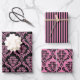 Ein Set von drei aufeinander abgestimmten Geschenkverpackungsblättern, darunter zwei Blätter Damast-Muster und ein Streifen über einem rosa Hintergrund. Diese Muster sind für jeden Anlass gut geeignet.